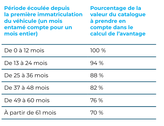 Pour tenir compte de la perte de valeur d’une voiture au fur et à mesure de son utilisation, la période qui s’est écoulée depuis la date de la première immatriculation est prise en compte et la valeur catalogue doit être multipliée par un pourcentage tel que déterminé selon le tableau ci-dessous :