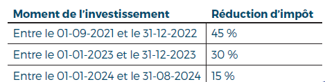 Le montant de la réduction d’impôt est limité à 1.750 euros par borne de recharge et par contribuable (ou 8.000 euros par borne de recharge bidirectionnelle). Cette réduction d’impôt ne peut être appliquée qu’une seule fois. Plus tôt vous réaliserez cet investissement vert, mieux ce sera. En effet, la réduction d’impôt sera décroissante pour être finalement supprimée à partir du 01/09/2024 :