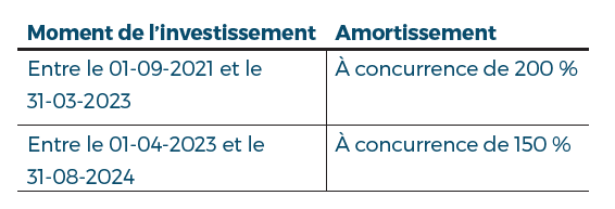 L’avantage est accordé sous la forme d’une déduction majorée pour les amortissements. Comme pour les particuliers, l’avantage obtenu via cette mesure sera progressivement décroissant pour être supprimé définitivement et ce, afin d’encourager un investissement plus rapide.