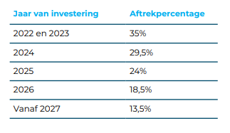 De investeringsaftrek wordt beperkt tot het bedrag van de maximale steunintensiteit en dat is 15 miljoen euro. Dat komt neer op een maximale investeringsaftrek van 60 miljoen euro als het normaal tarief van 25% vennootschapsbelasting van toepassing is. Om zo snel mogelijk tot een vergroening te komen, wordt dit voordeel stelselmatig afgebouwd: